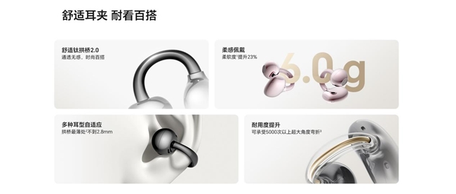 荣耀耳夹耳机2 Pro 搭载全新舒适钛拱桥 2.0,单只耳机仅重6g,耳机拱桥内置记忆钢丝与钛合金材质,柔软度提升23%,质感软弹,对耳朵的物理压力更小,拱桥最薄处不到2.8mm,为不同耳型预留更宽裕的适配空间,无论耳型大小均能实现精准贴合,全新耳机人体工学设计,耳机表面曲度经过优化,面积大幅增加,保障佩戴贴合度的同时,带来更舒适透气的佩戴体验,达到了耐用性和佩戴舒适性的完美平衡。