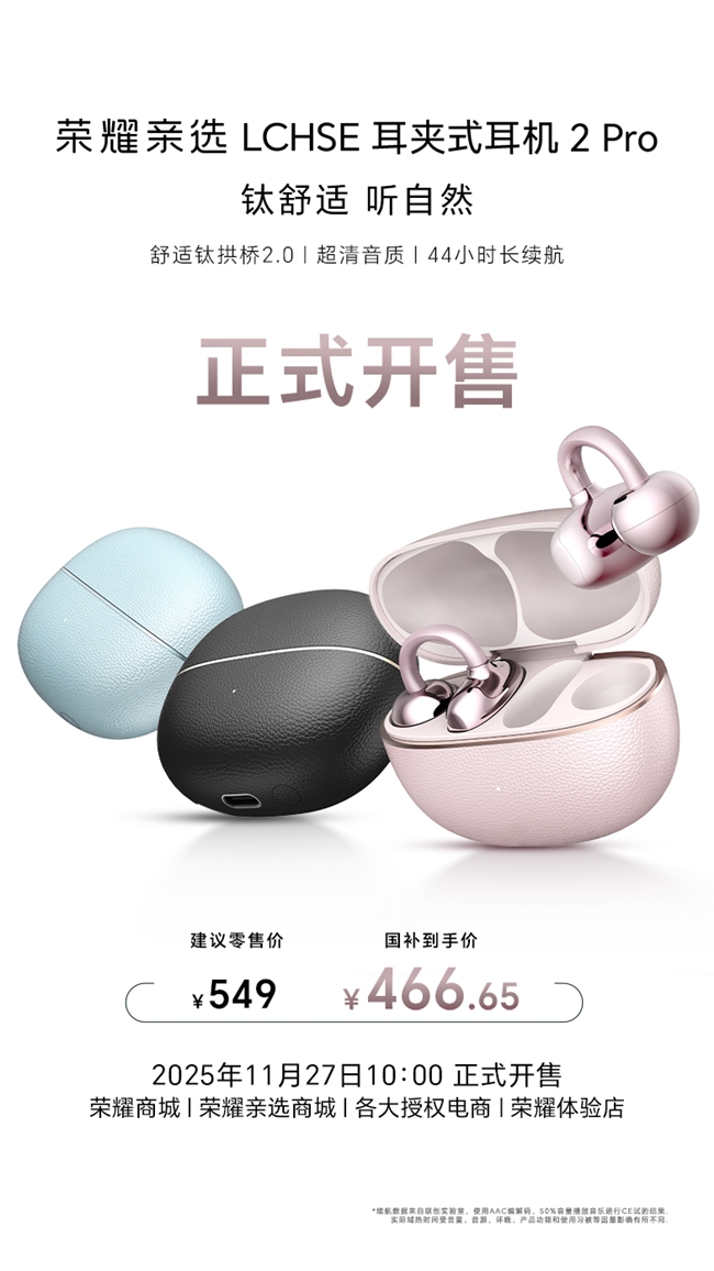作为荣耀全新推出的耳夹耳机,荣耀耳夹耳机2 Pro集时尚外观、舒适佩戴、通透音质、超长续航、更丰富的智能交互于一身,为用户提供全能均衡的越级体验,是全民耳夹时代的满配答案。荣耀耳夹耳机2 Pro于11月27日10:00全渠道正式开售,国补到手价466.65元。