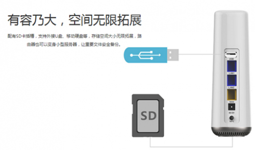 酷开智能无线路由器配有SD卡插槽,支持外接U盘、移动硬盘等,存储空间大小无限拓展,路由器也可以变身小型服务器,让重要文件安全备份。