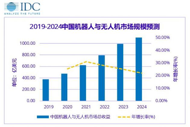 IDC发布的《IDC全球机器人与无人机支出指南》显示,中国市场无人机总收益将逐年增加,但年增长率在2021年开始放缓。