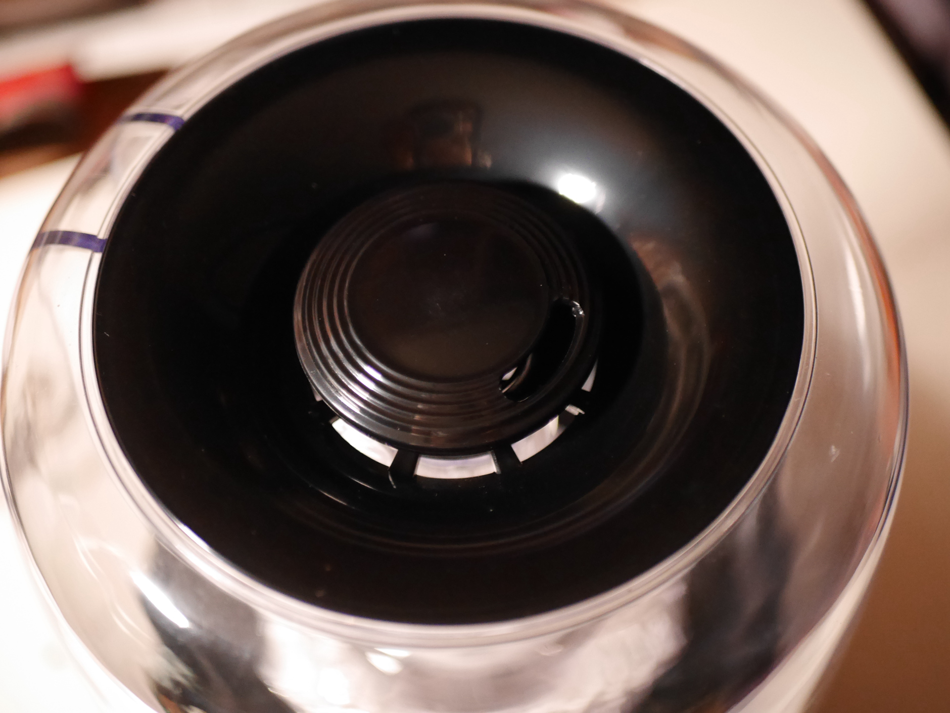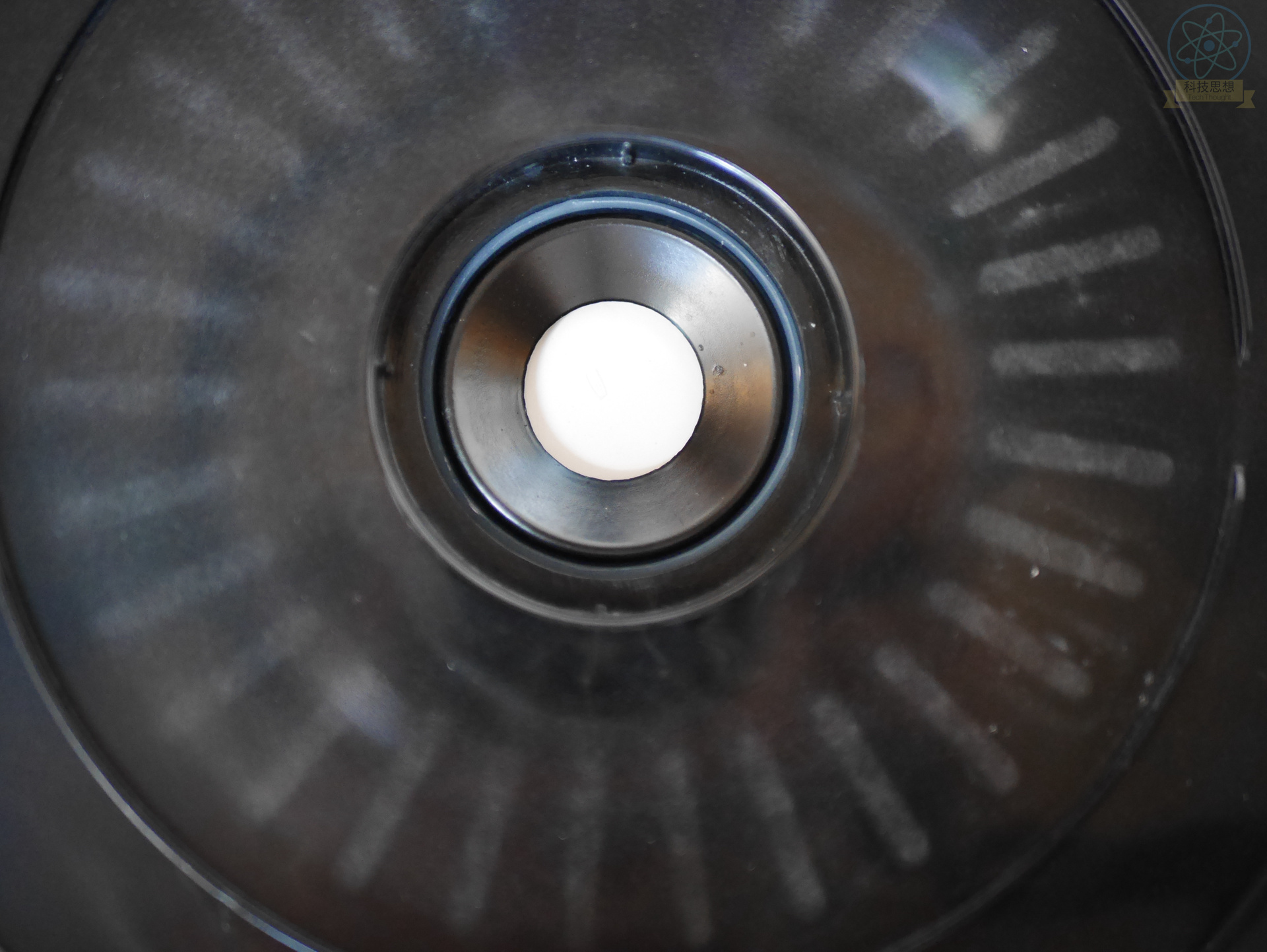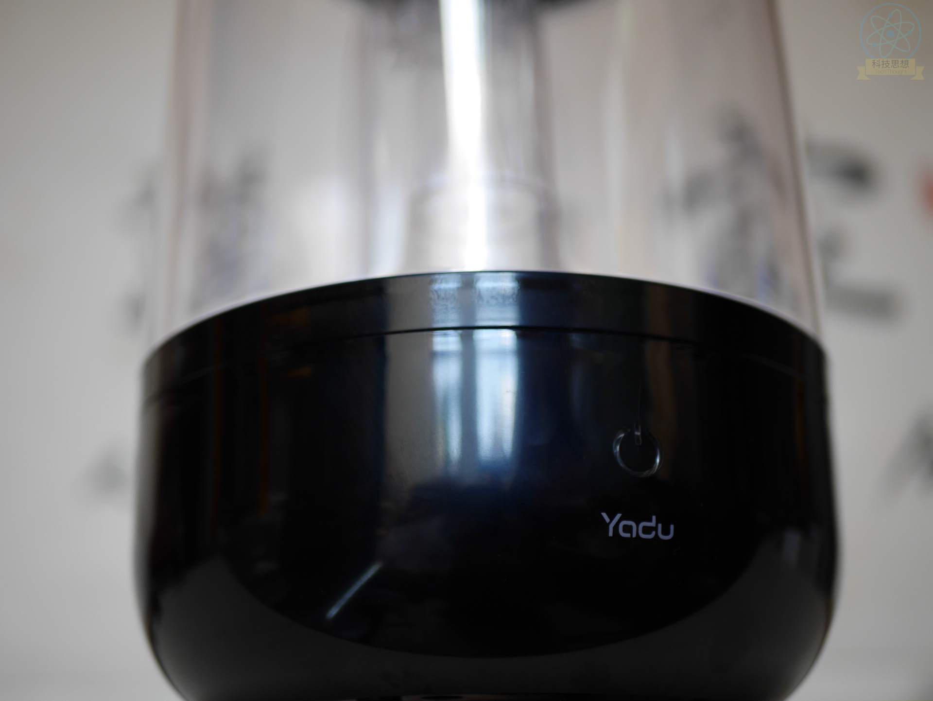 看一下加湿器底部,这是一个黑色的底座,做工还算不错,而且也没什么复杂的配置,就是一枚触摸式开关和切换档位的按键,其中这个按键是配了LED灯的,可以通过灯色来判断工作状态,默认开启后就是最大雾量。