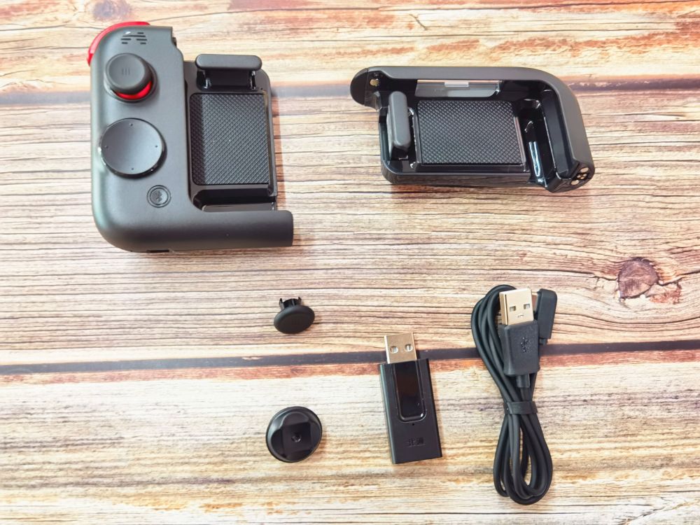 开箱配件有:北通G2组合手游手柄双柄、替换式键帽、USB数据线以及2.4g连接器。