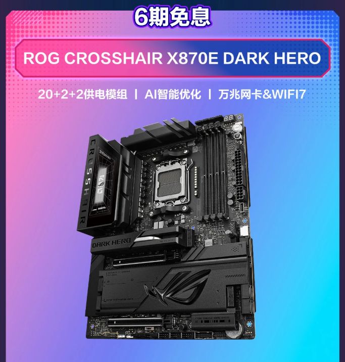 ROG CROSSHAIR X870E DARK HERO主板专为硬核玩家打造,采用经典黑配色,诠释低调而富有质感的奢华风格。搭载Polymo动态灯效2.0并支持神光同步,让玩家轻松打造个性化灯效。该主板单品售价4899元,京东商城可享6期免息。